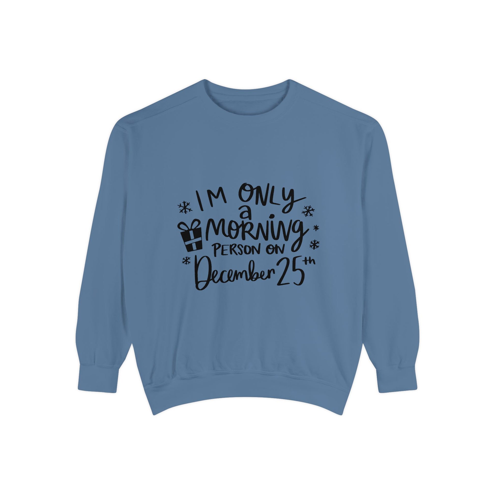 Cozy up in this unisex garment-dyed sweatshirt that adds a touch of whimsy to your holiday season. Featuring the playful phrase, "I’m only a morning person on December 25th," this sweatshirt brings a festive spirit and smiles to any Christmas gathering. Its soft fabric and relaxed fit provide comfort, making it perfect for lounging by the fire or unwrapping gifts with family. Ideal for holiday parties, cozy evenings at home, or as a lighthearted gift for friends and family, this sweatshirt is especially great for those who embrace the joyful chaos of the holidays. Celebrate Christmas morning in style with a piece that captures the warmth and magic of the season.